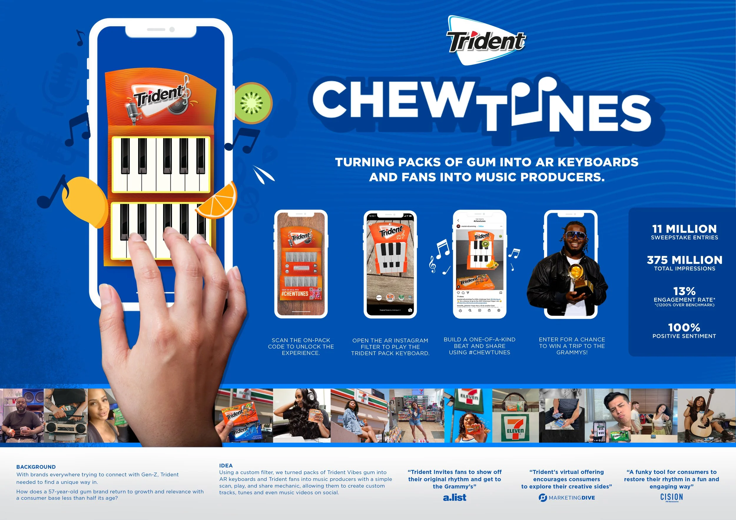 Trident was struggling with a lack of growth to the brand due to a lack of relevancy with their younger consumers. The brand’s national campaign was focusing on ‘Chewing Through’ life’s everyday tensions. In concepting, we found that music is an enjoyable way to relieve stress especially among our gen-z and millennial target. Using this insight, we created the Chew Tunes program that gives our shoppers a tool to chew through the everyday stresses with a fun and engaging way to create their own rhythm.
